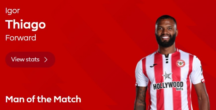 20分钟梅开二度,官方:伊戈尔当选布伦特福德3-1曼联全场最佳