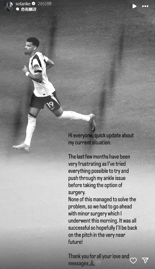 索兰克:今天接受了脚踝小手术,手术很成功希望很快回到球场