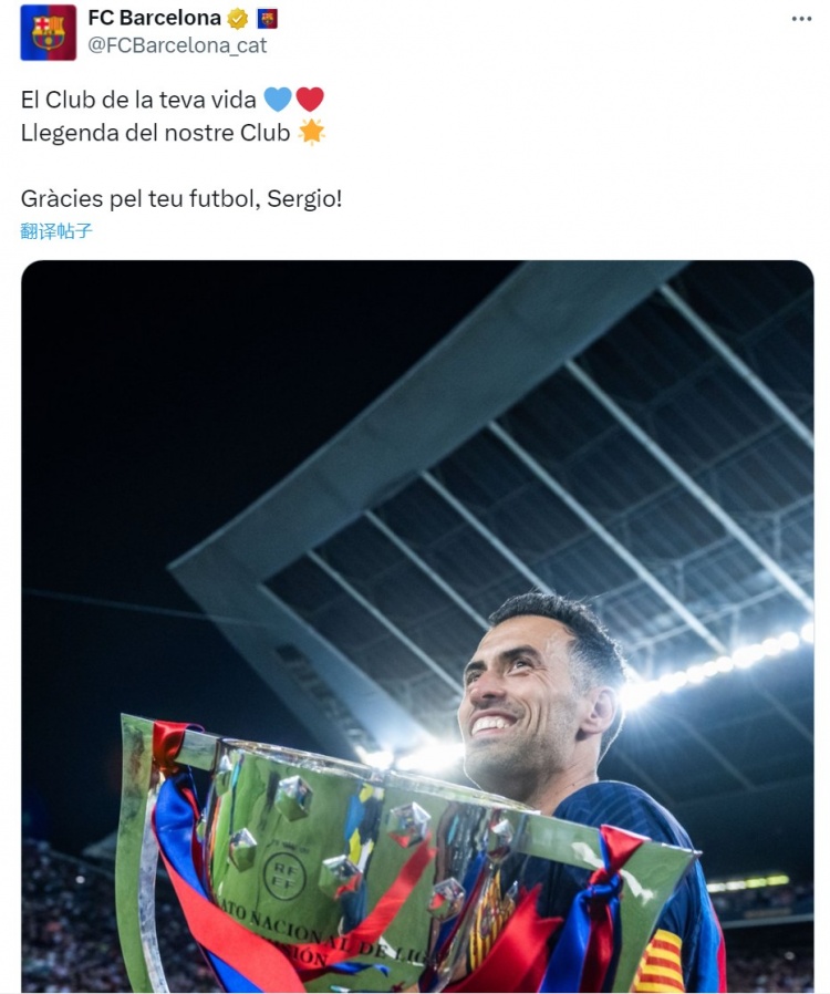 巴萨官方:布斯克茨在巴萨赢得过32座冠军,他正迎来生涯最后征程