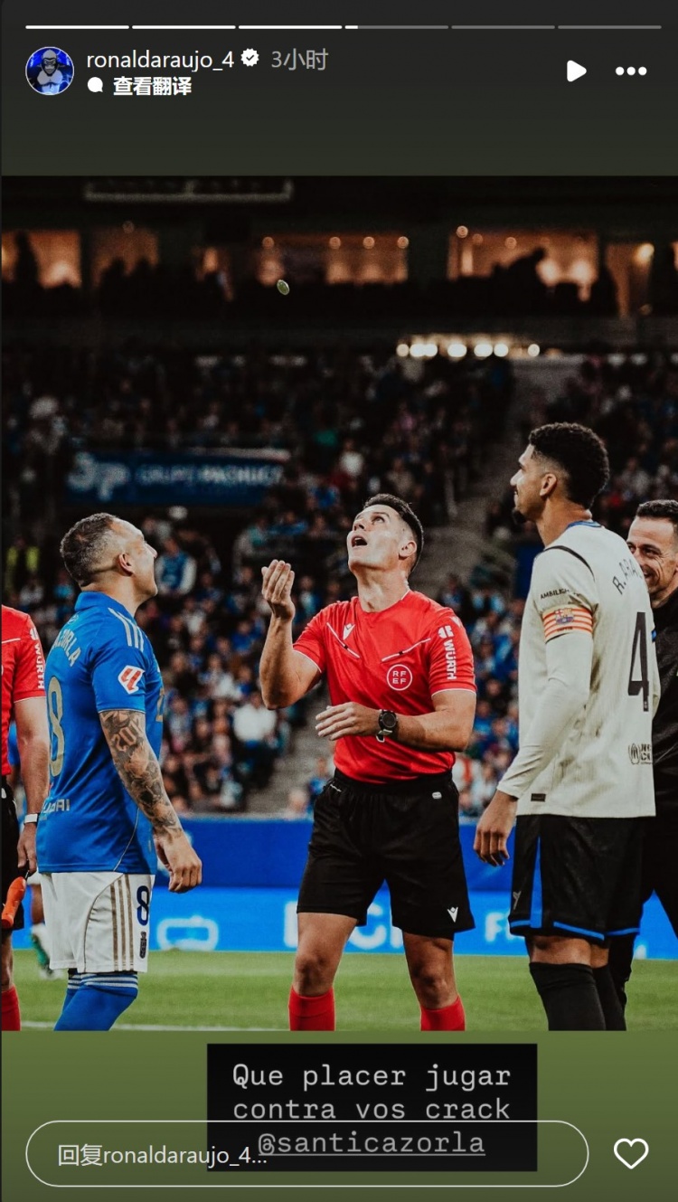 9月26日讯 西甲第6轮比赛,巴萨客场3-1击败皇家奥维耶多。巴萨队长阿劳霍社媒晒出与卡索拉赛前选边的合照,配文:“很高...