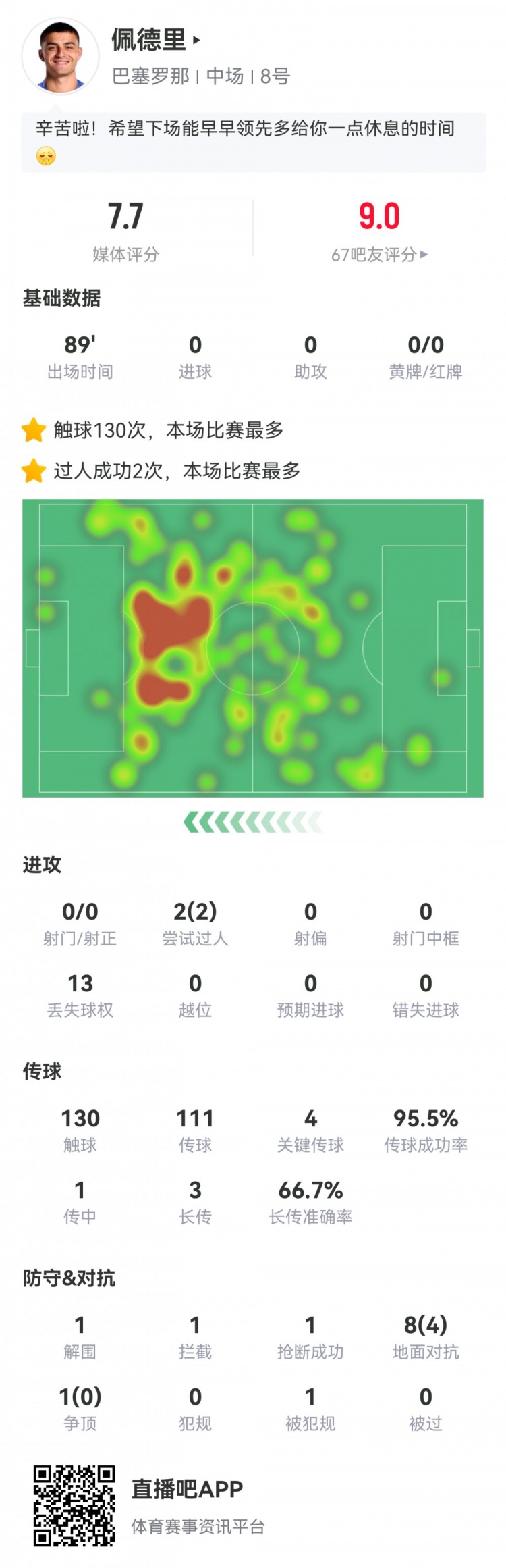 指挥官!佩德里数据:4次关键传球,130次触球,传球成功率95.5%