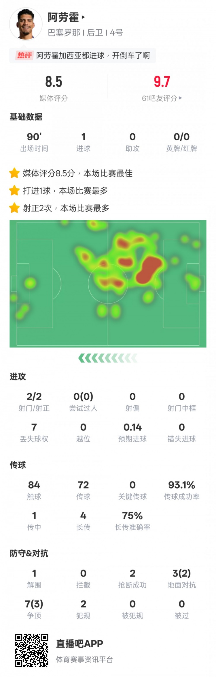 阿劳霍本场数据:1进球2抢断传球成功率93.1%,评分8.5全场最高