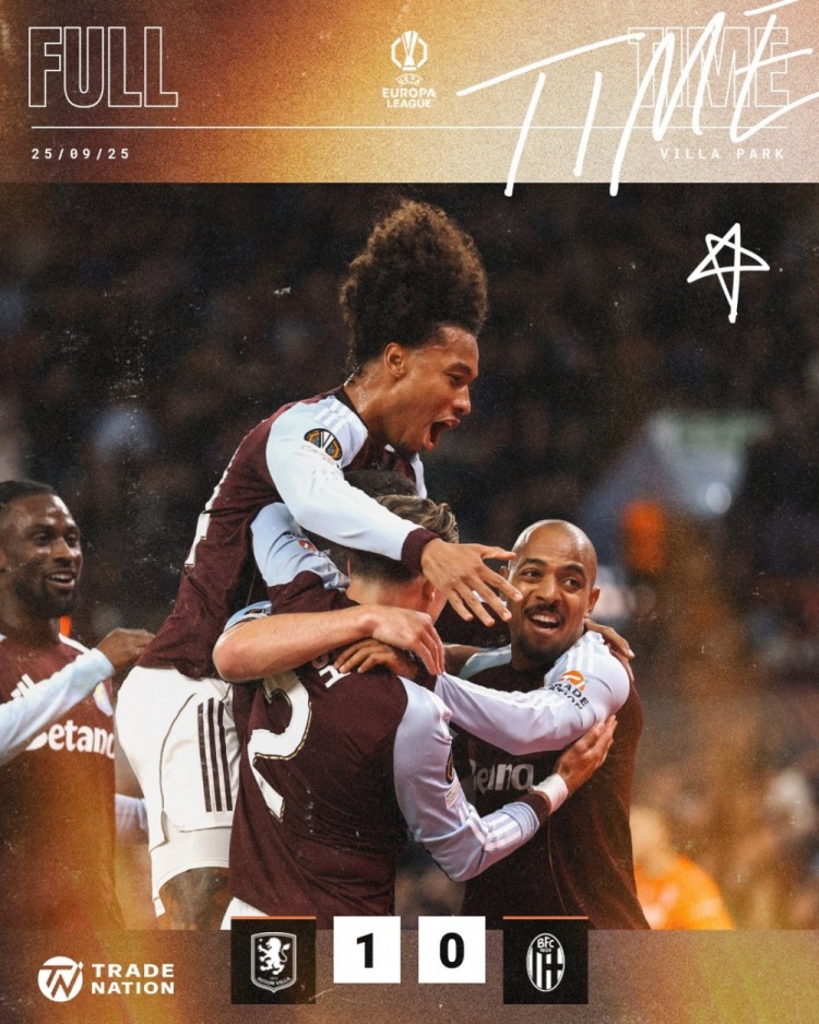 9月26日讯 欧联杯联赛阶段第一轮,维拉主场1-0战胜博洛尼亚收获赛季首胜,赛后维拉官方发布海报庆祝。维拉此前联赛3平2...