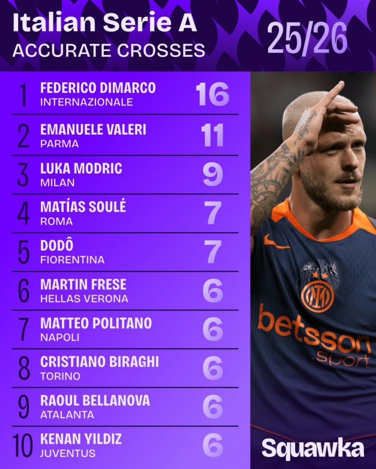 本赛季意甲迪马尔科16次精准传中第一,莫德里奇9次排名第三