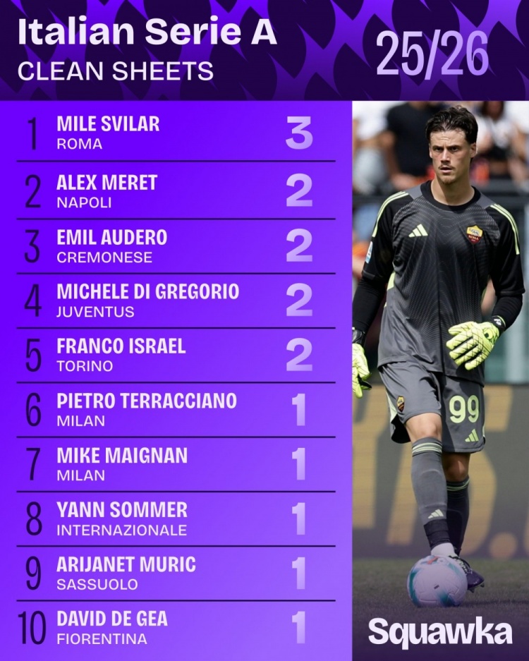 9月26日讯 据Squawka的数据统计,在2025年的24场意甲联赛中,罗马门将斯维拉尔保持了14场零封,比其他任何门...
