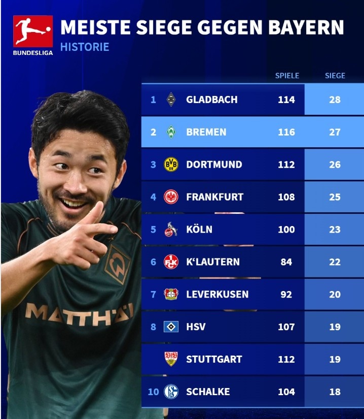 德甲各队历史胜拜仁次数榜:门兴28场第一,本轮交手的不莱梅第二