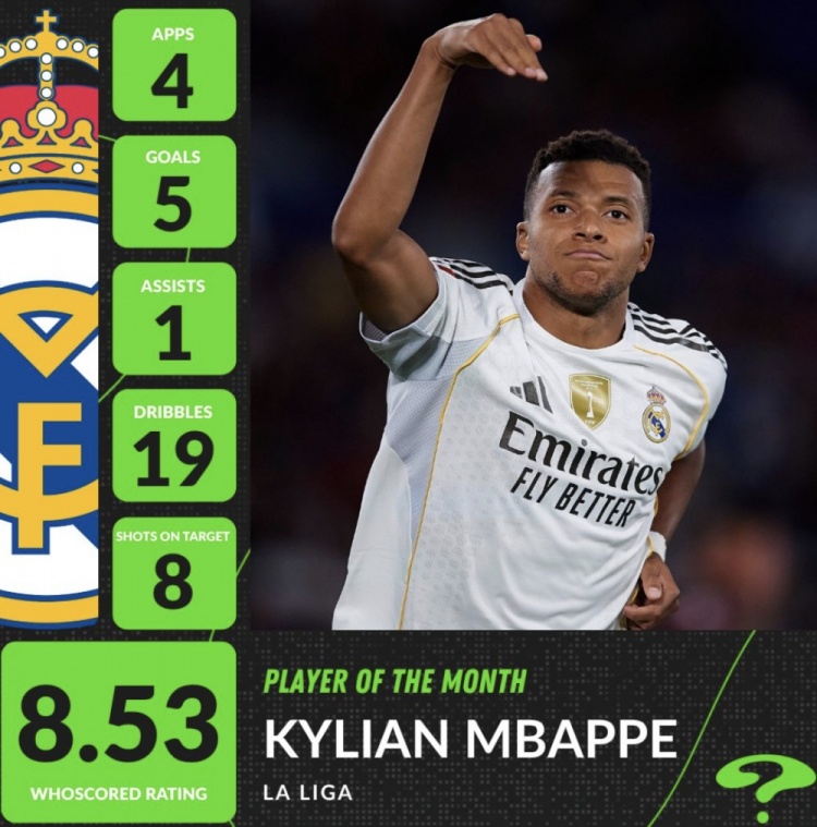 Whoscored评选西甲9月最佳球员:姆巴佩4场5球1助攻成功当选