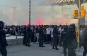 巴萨巴黎大战一触即发!大批巴黎球迷在球场前聚集并呼喊口号