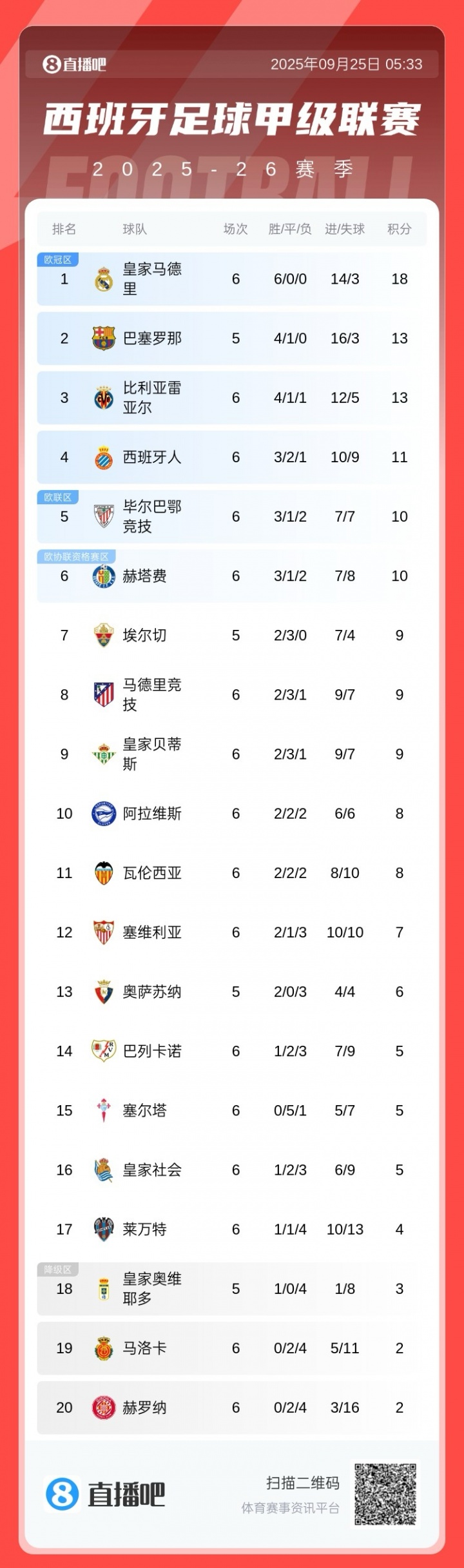 09月25日讯 西甲3场比赛战罢,马竞3-2绝杀巴列卡诺,皇家社会1-0马洛卡,赫塔菲1-1阿拉维斯,最新积分榜如下:...