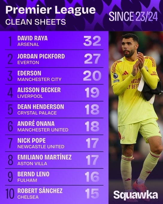 9月25日讯 自2023-24赛季以来的英超门将零封榜出炉,阿森纳门将拉亚以32场零封第一,皮克福德、埃德森分列二三。排...