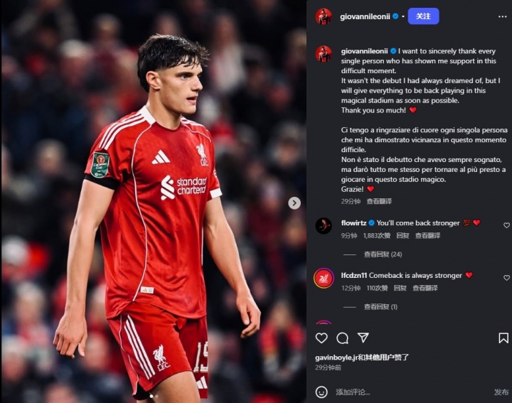 09月25日讯 据名记罗马诺报道,利物浦18岁中卫莱奥尼十字韧带撕裂,将缺阵数月,争取赛季末复出,莱奥尼刚刚更新社媒。莱...