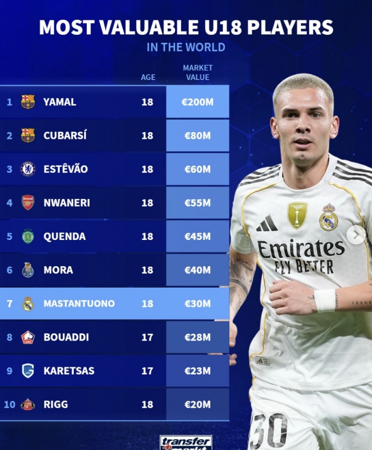 U18球员身价前十:亚马尔2亿欧领跑,库巴西第二马斯坦托诺第七