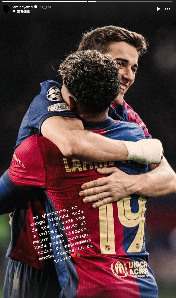 9月24日讯 亚马尔今天在Instagram发文,祝福队友加维。加维因为重伤而将缺阵4-5个月,据悉球员因此心态崩溃。亚...