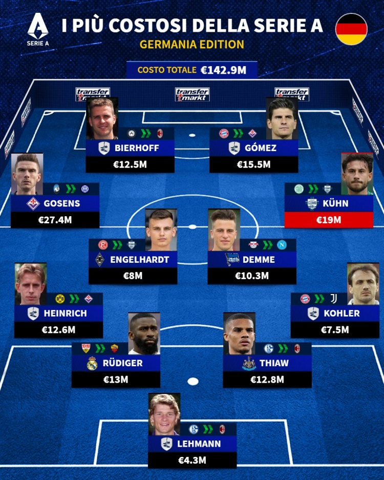 德国球员转会意甲球队价格最高阵:比埃尔霍夫、戈森斯、库恩在列