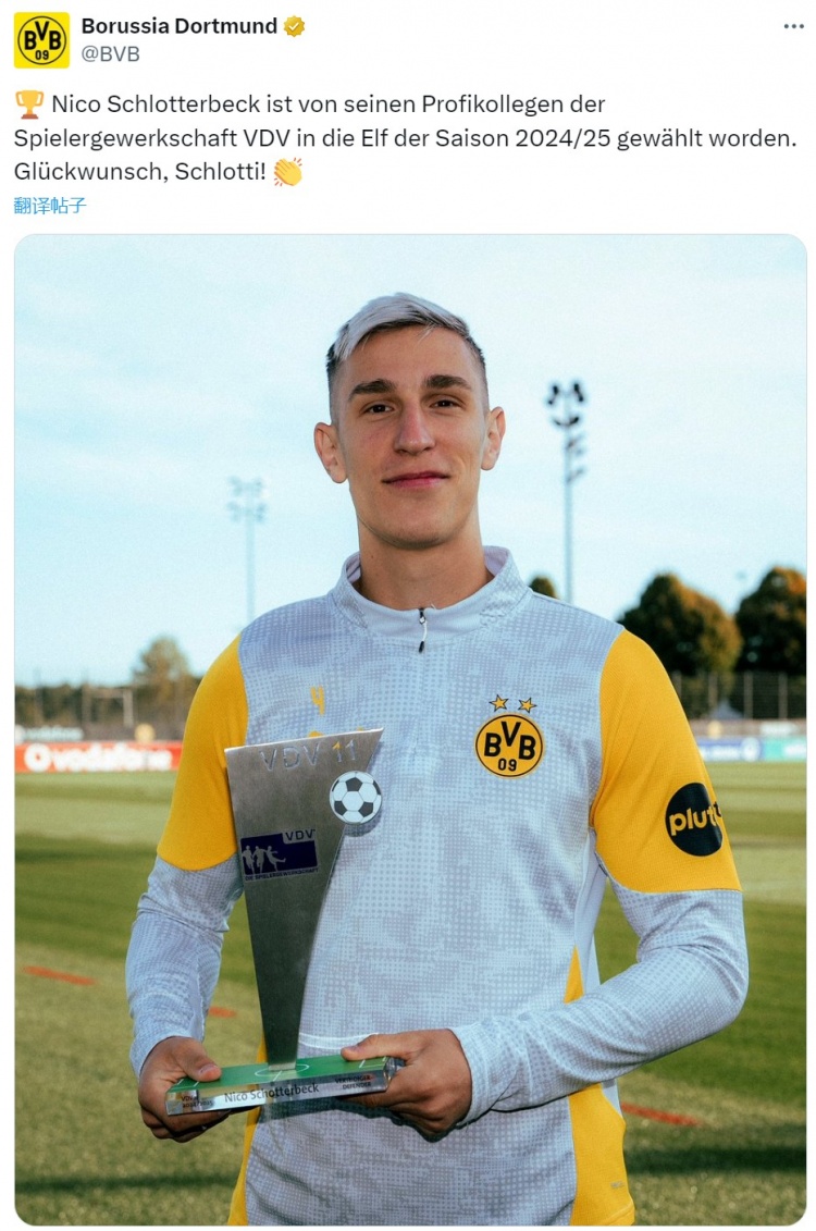 施洛特贝克入选VDV上赛季最佳阵容,多特社媒晒球员与奖杯合照