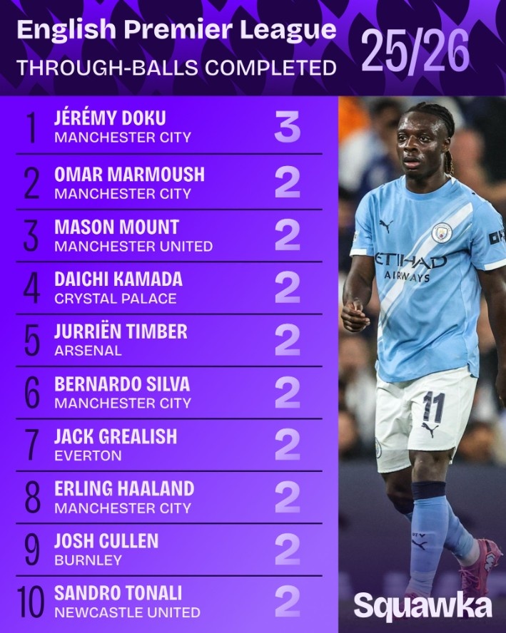 9月24日讯 本赛季英超战罢5轮,“Squawka”统计了所有球员成功完成直塞次数的排名,曼城边锋多库以3次领跑。1.多...
