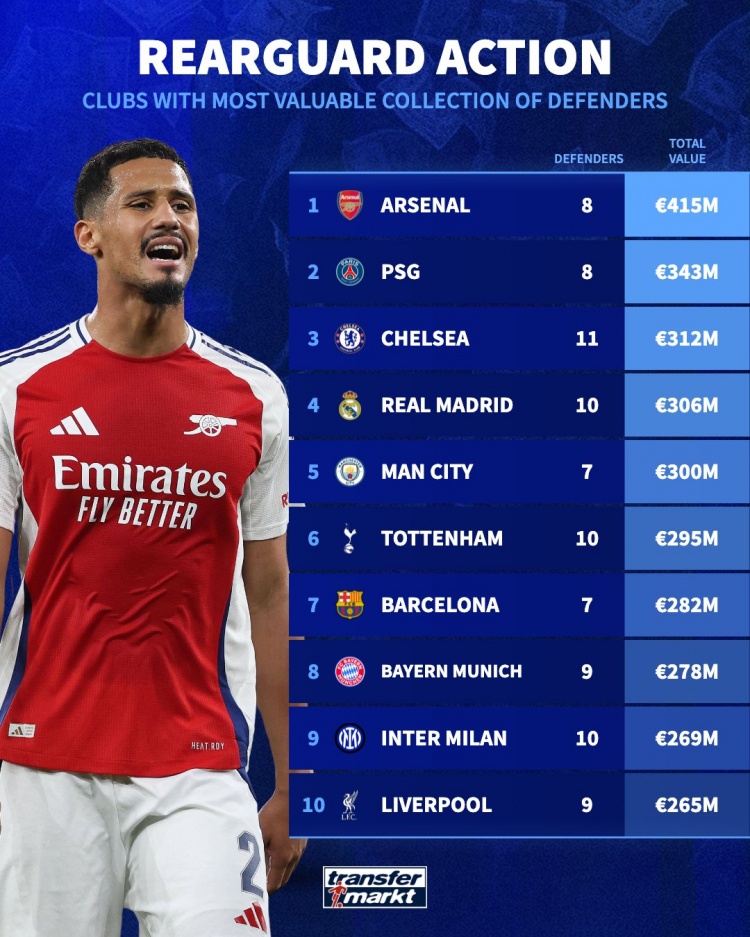 各队后卫总身价排名:阿森纳4.15亿欧居首,巴黎、切尔西二三位