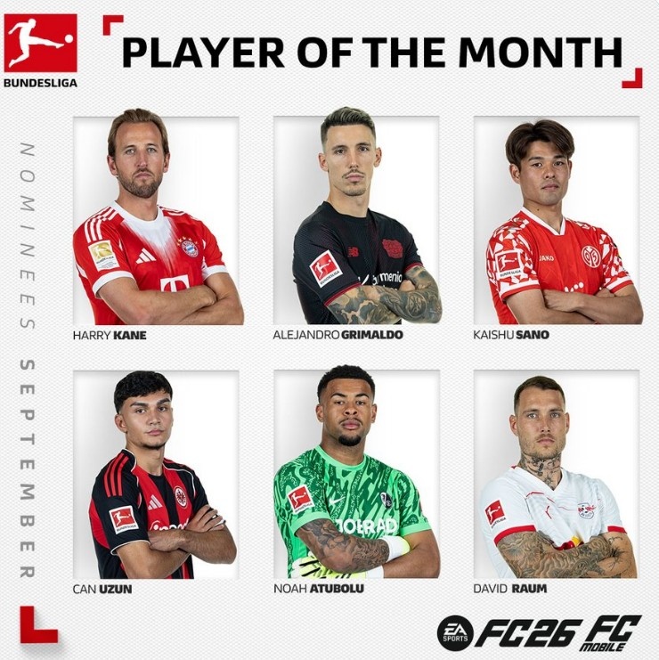 德甲官方9月最佳球员候选:凯恩领衔,格里马尔多、乌尊在列
