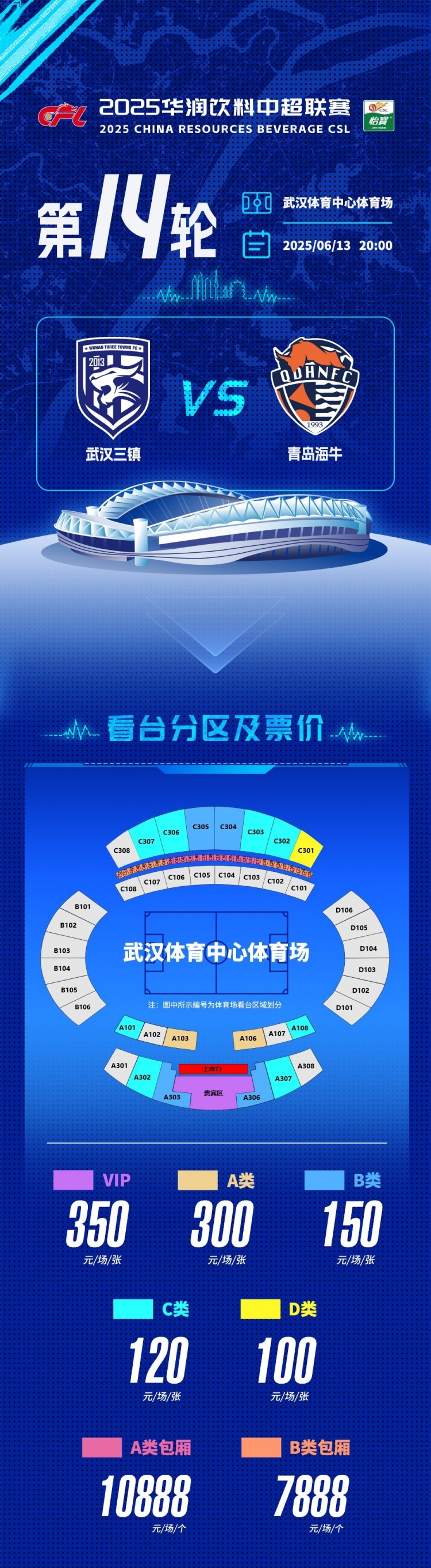 6月13日,2025中超联赛第14轮,武汉三镇将坐镇主场迎战青岛海牛。本场比赛球票将于今日(6月6日)18:00开启发售...