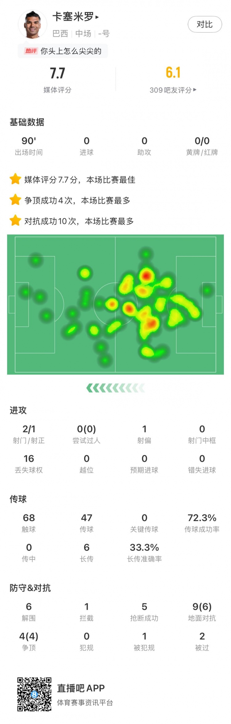 后防大闸,卡塞米罗全场数据:7.7分队内最高,6次解围5次抢断