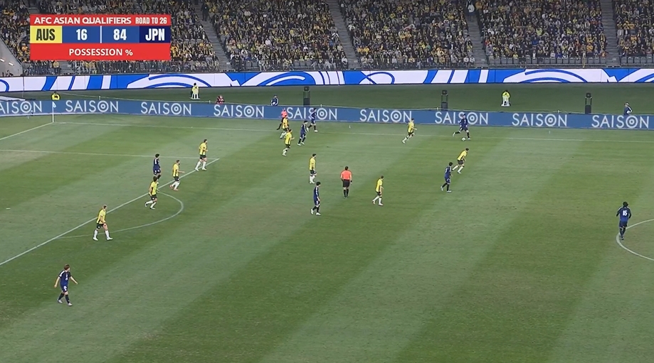 开场10分钟,日本控球高达84%传球成功率91%,澳大利亚仅25脚传球