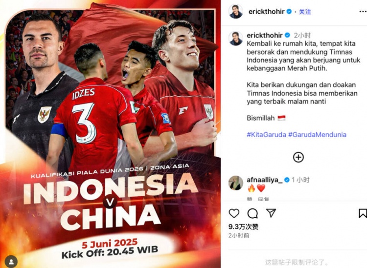 托希尔社媒晒海报:回到主场,我们为肩负国家荣誉的印尼队加油!