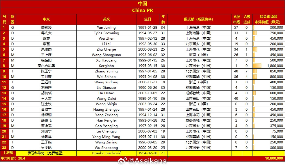 6月5日讯 国足对阵印尼队的23人名单公布,身价方面,印尼队身价约国足3倍。国足23人名单平均年龄28.4岁,总身价为1...