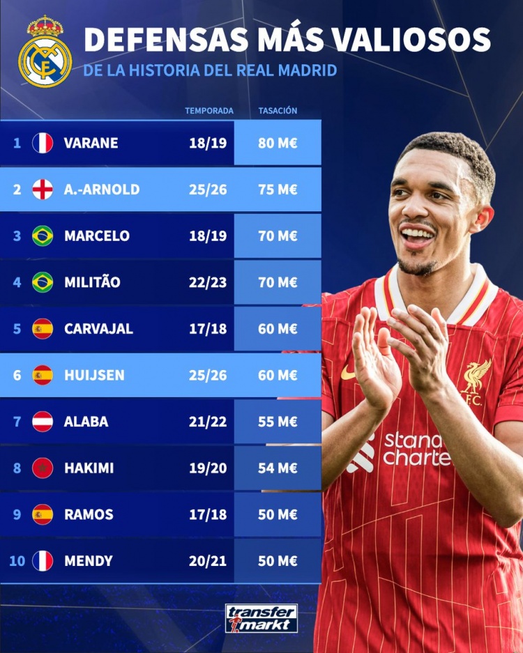 皇马队史后卫身价榜:阿诺德7500万欧第二,怀森第六拉莫斯第九