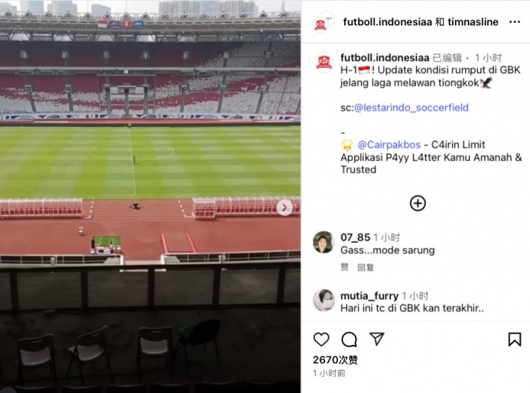 6月4日讯 印尼国家队官方ins今日更新,晒出了明日主场与国足比赛主场的草皮情况。印尼国家队官推写道:“与中国队的比赛赛...