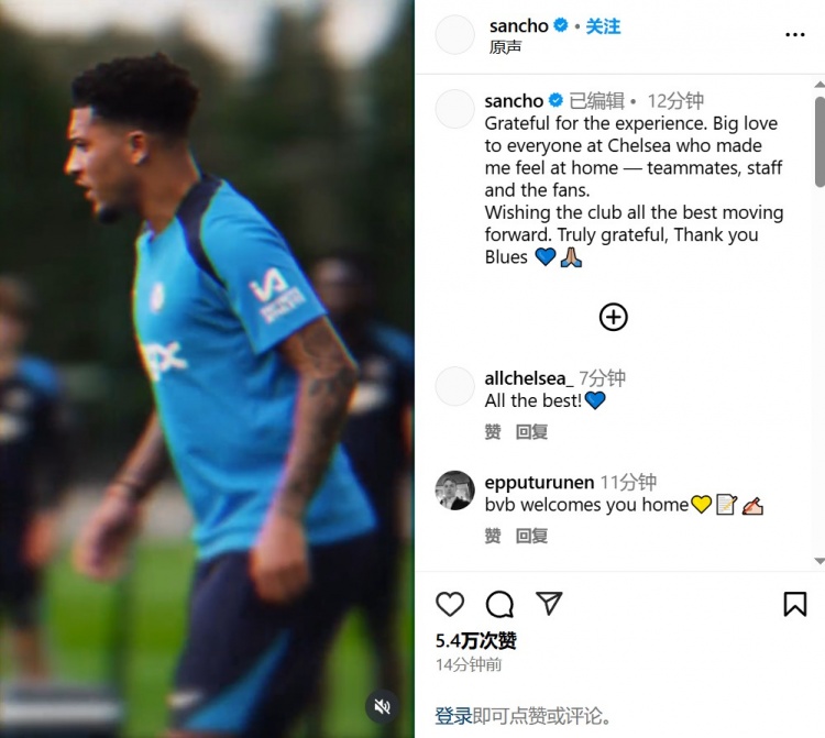 桑乔社媒:感谢切尔西的每一个人,祝愿俱乐部未来一切顺利💙