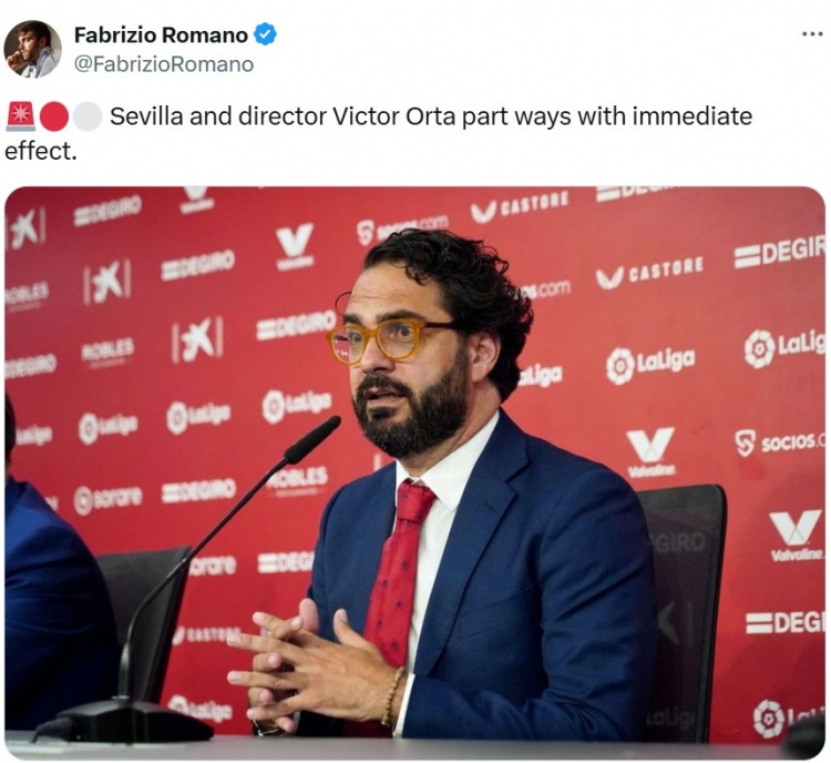 罗马诺:塞维利亚与体育总监维克托-奥尔塔分道扬镳,即日生效