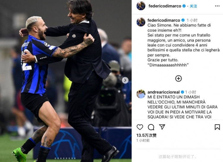 迪马尔科告别小因扎吉:你亦兄亦友,四年来我们拥有无数美好瞬间