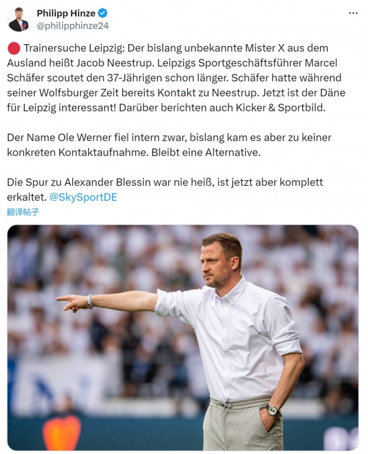 6月3日讯 据记者Philipp Hinze报道,哥本哈根主帅内斯特鲁普是莱比锡新帅候选。Philipp Hinze透露...