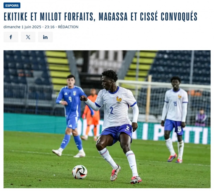官方:埃基蒂克因背部疼痛、米洛因家庭原因退出法国U21
