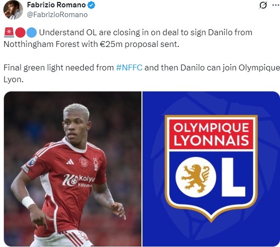 罗马诺:转会费2500万欧,里昂接近和森林就签下中场达尼洛达协议