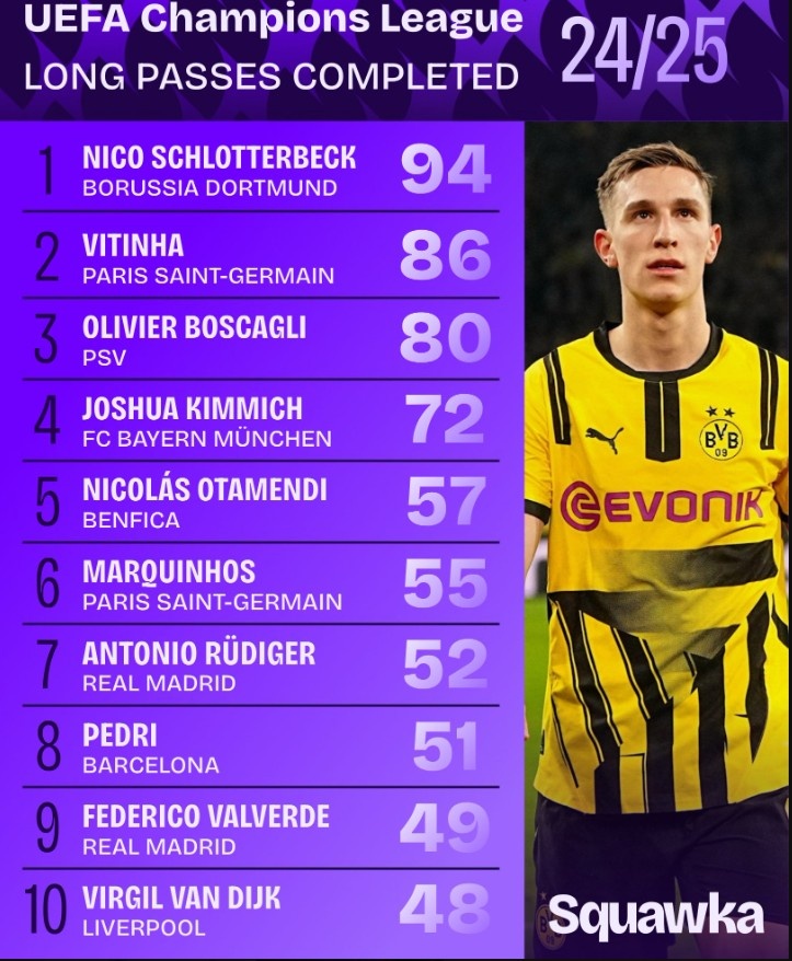 2024-25赛季欧冠长传榜:施罗特贝克94次居首,维蒂尼亚86次次之