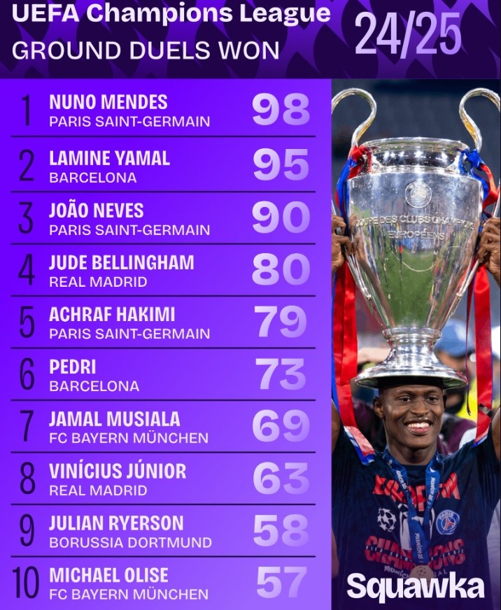 2024-25赛季欧冠地面对抗榜:努诺-门德斯98次居首,亚马尔次之