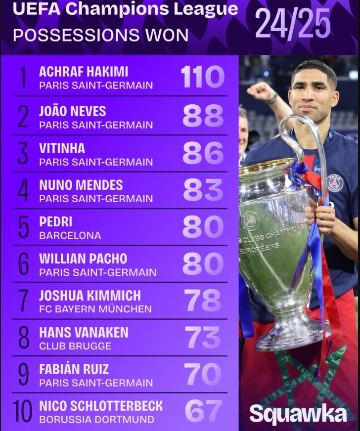 2024-25赛季欧冠夺回球权榜:巴黎包揽前四&六名球员进入前十