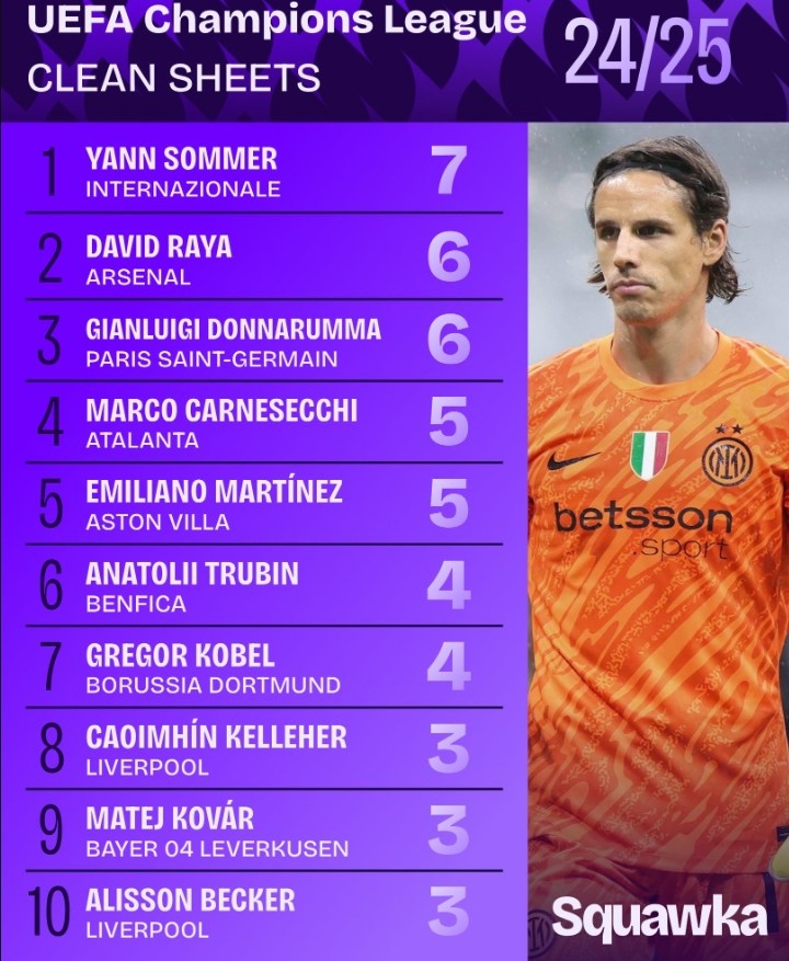 2024-25赛季欧冠零封榜:索默7次居首,拉亚、多纳鲁马6次次之