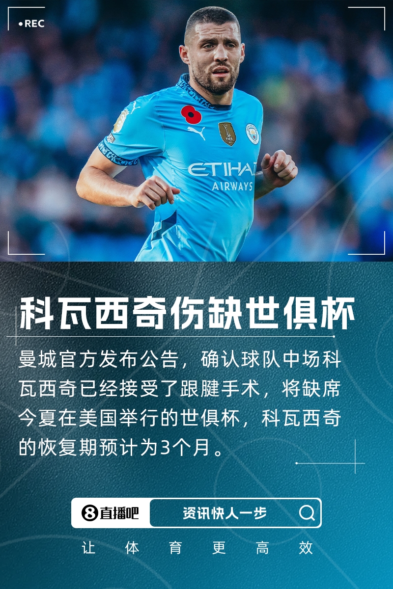 预计伤缺3个月!曼城官方:科瓦西奇接受跟腱手术,将缺席世俱杯