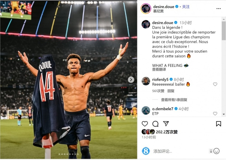 6月2日讯 欧冠决赛,杜埃2射1传,帮助巴黎5-0击败国米,捧起冠军奖杯。杜埃在社交媒体上晒出自己庆祝的照片,并写道:“...
