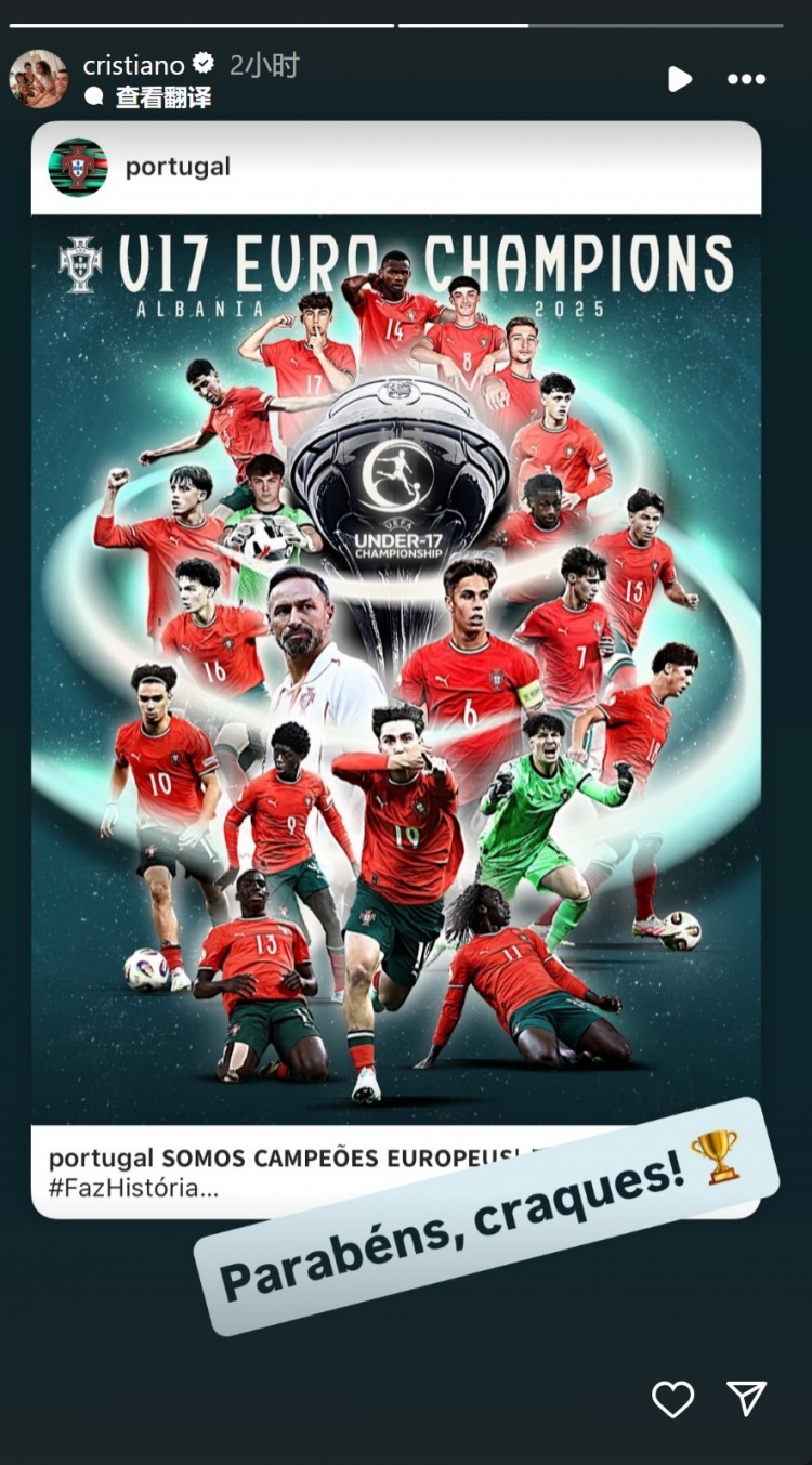 🏆葡萄牙斩获U17欧洲杯冠军,C罗社媒转发夺冠海报祝贺