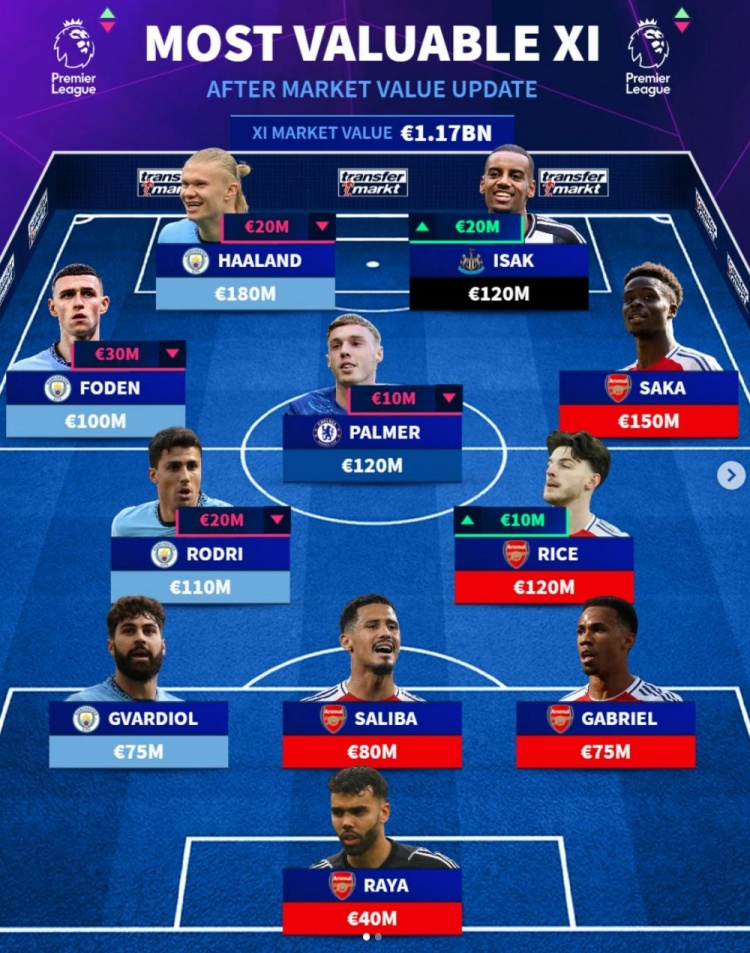 德转列英超最贵阵:哈兰德、萨卡领衔,曼城+枪手9人在列