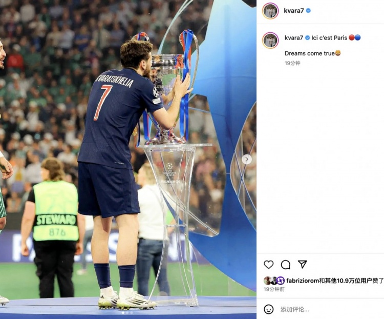6月1日讯 欧冠决赛,巴黎5比0横扫国米,队史首次问鼎大耳朵杯。赛后,巴黎前锋克瓦拉茨赫利亚更新社媒晒照并配文写道:此地...