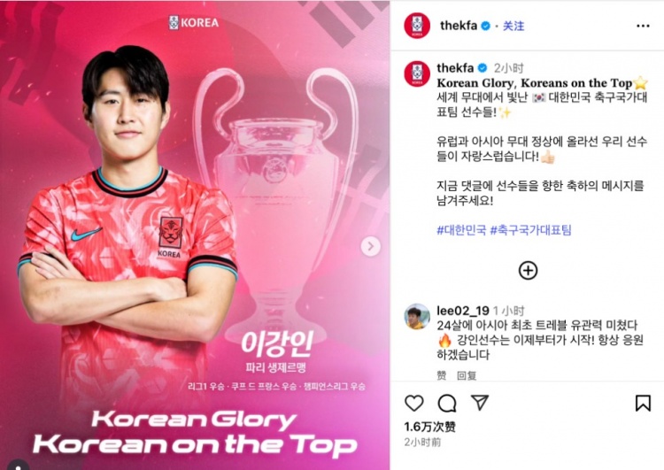 韩国足协再晒“韩国荣耀”主题海报,祝贺李刚仁随队夺欧冠冠军