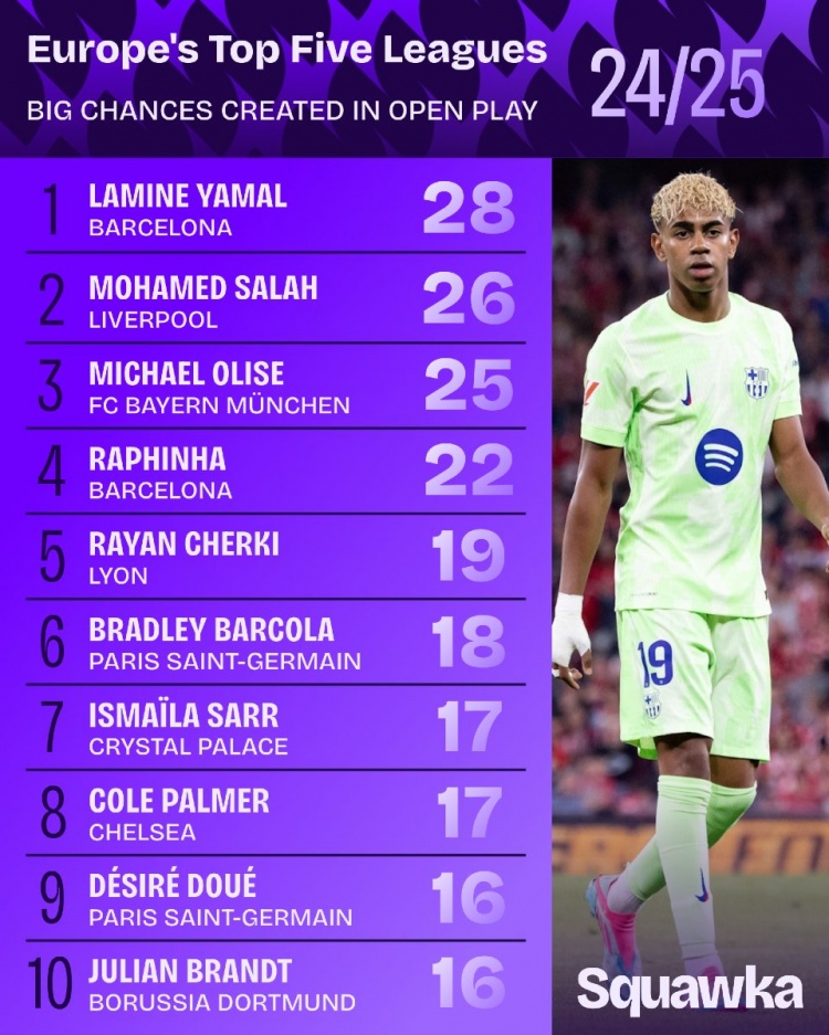 五大联赛运动战创造重大机会榜:亚马尔、萨拉赫、奥利塞前三