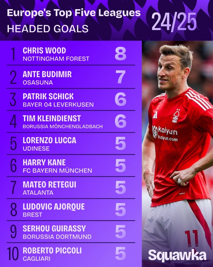 本赛季五大联赛头球进球榜:伍德8球居首,布迪米尔7球&希克6球