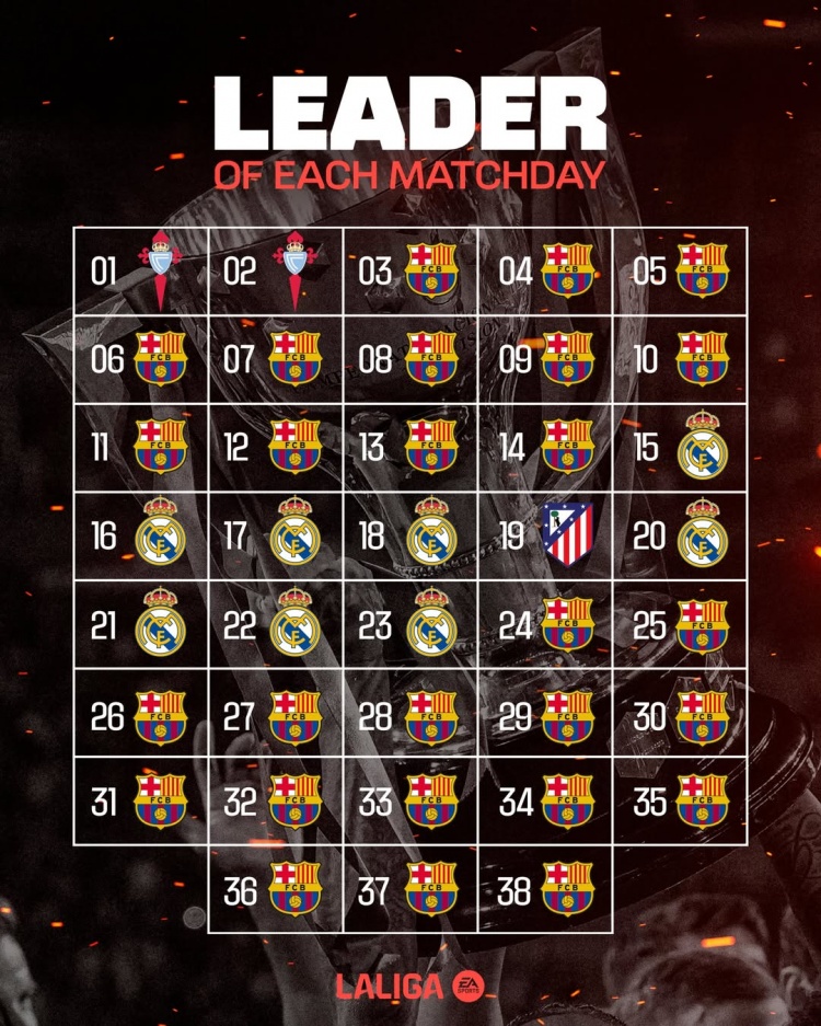 5月30日讯 本赛季的西甲联赛尘埃落定,巴萨赢得冠军。西甲官方更新社媒动态,晒出38轮比赛榜首球队的变化,巴萨27轮位居...