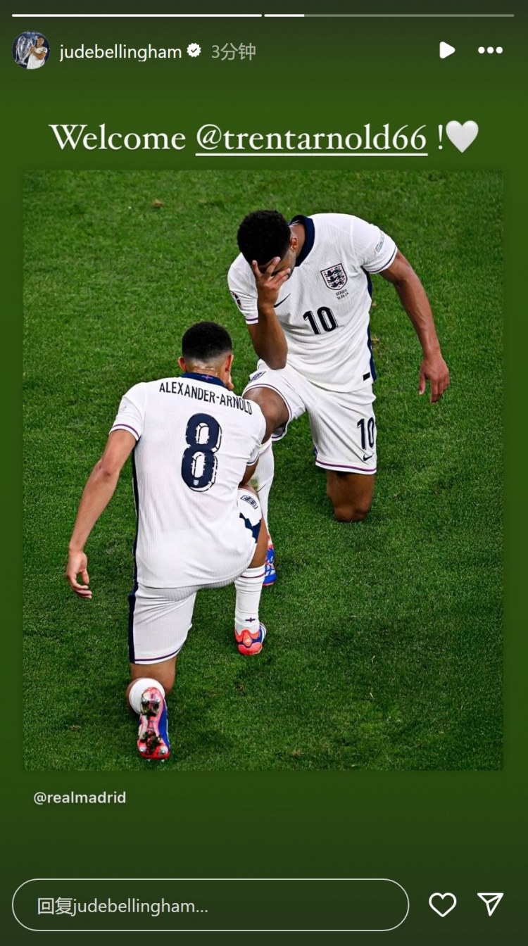 相聚皇马⚽贝林厄姆社媒晒与阿诺德国家队合照:欢迎阿诺德!