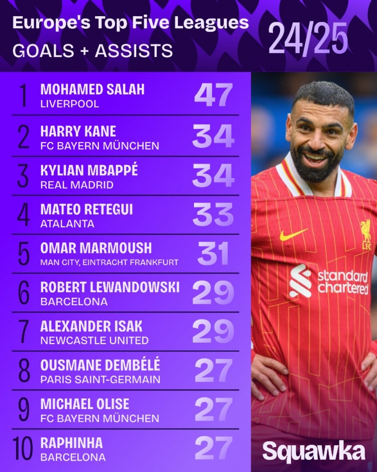 5月27日讯 Squawka列本赛季五大联赛球员进球+助攻榜,萨拉赫47球居首,凯恩、姆巴佩34球并列第二。本赛季五大联...